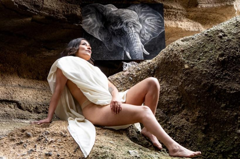 En cambio, la fotografía de Giovanni es un testimonio de la realidad y el esfuerzo humano. El fotógrafo logró capturar el clímax del lugar, destacando las texturas ásperas del suelo rocoso, el matiz arenoso del entorno, la pintura de fondo y la dificultad de acceso a ese espacio. Más allá del paisaje, el retrato de la modelo es un estudio de la vulnerabilidad: Se aprecian las imperfecciones del cuerpo, los pliegues de la piel desnuda, su rostro refleja el cansancio y la preocupación de una espera larga que ella y Giovanni conocían, el brillo y el opaco revelan un alma más que desnuda.